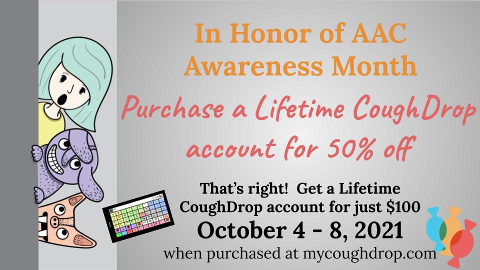 October 4 - 8, 2021, you can purchase a lifetime CoughDrop account through our website (mycoughdrop.com) for just $100 USD.