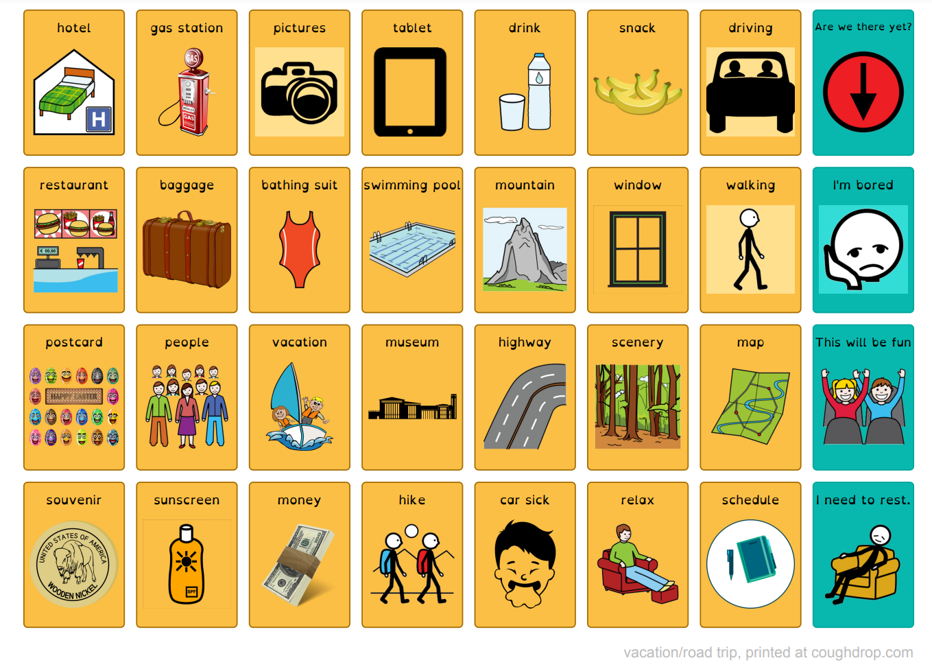 If you know where you'll be heading for your trip, you might consider creating a speech board containing words or options that relate to your vacation.