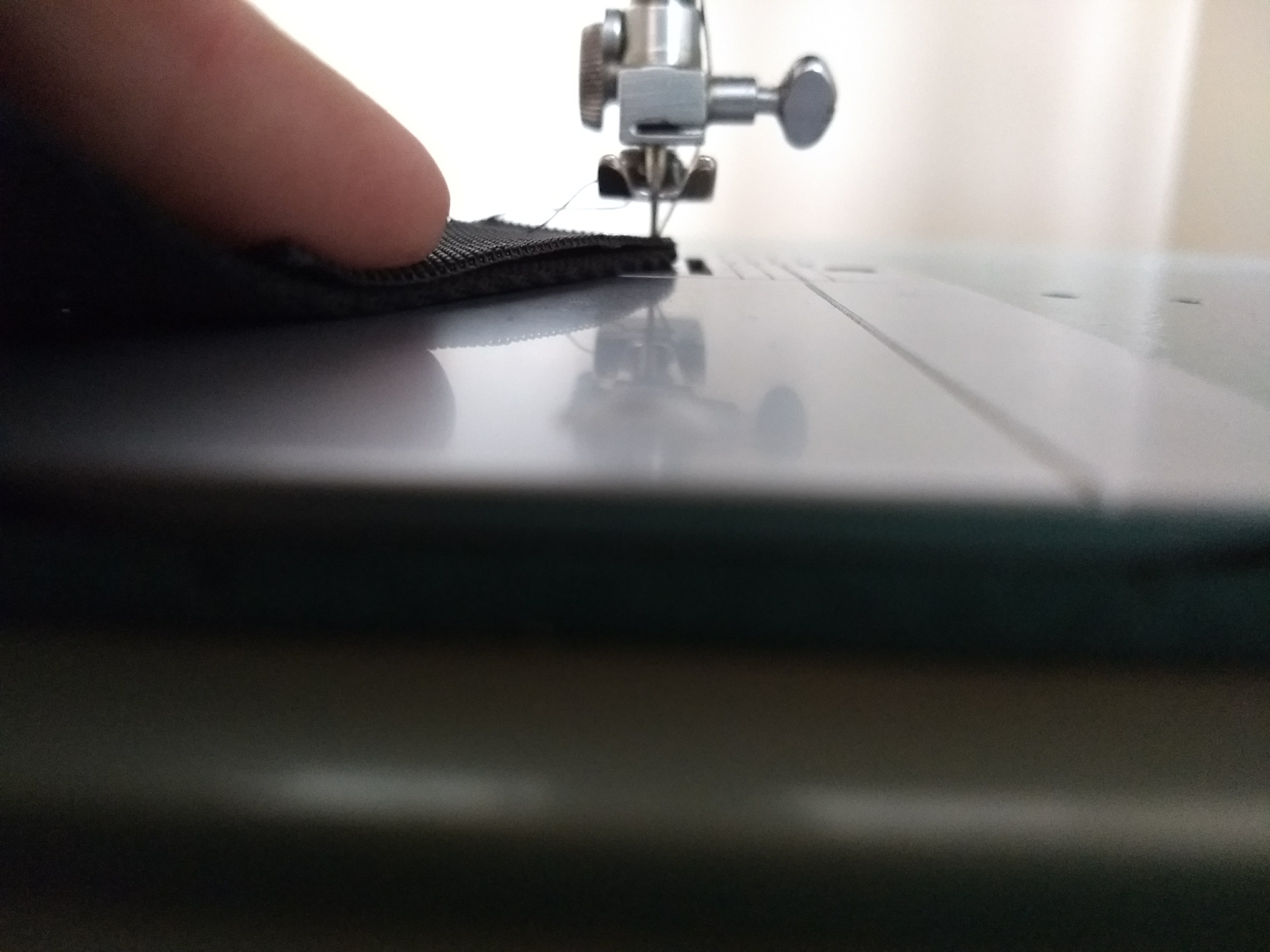 Hand turn the needle when you get to the corners. Keep the needle in the material, lift up the sewing foot and readjust Velcro/strap so you’re sewing the direction you want to go. Then put the sewing foot down again and sew