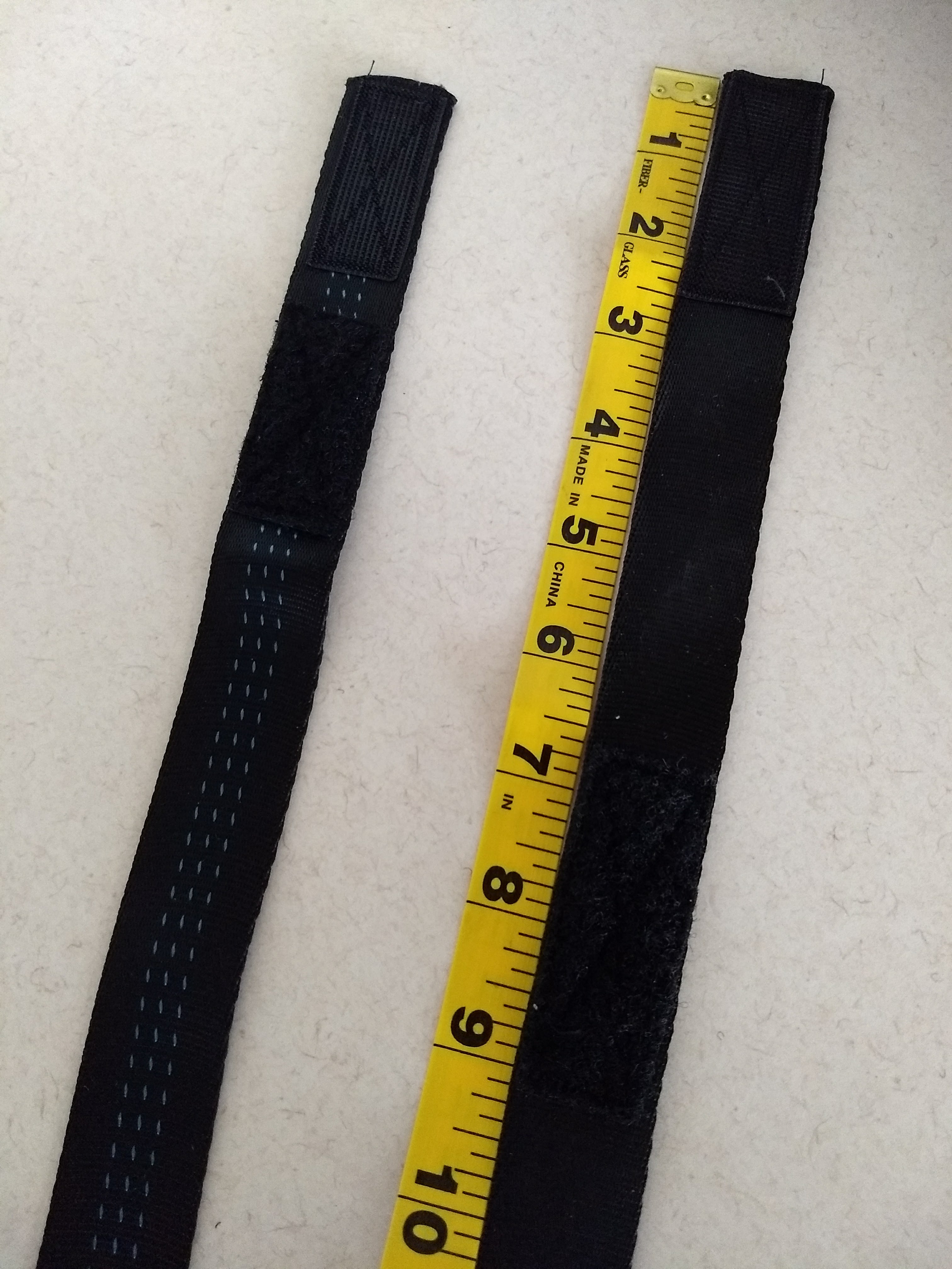 3: Attach Velcro to the webbing on alternate sides of the webbing. I put the shorter sets of velcro on the front facing side of the webbing, spaced about ¾” apart. And then the longer sets of velcro on the backfacing side of the webbing spaced about 4” apart. Obviously, you can space the velcro at the ends differently. Just make sure you have enough webbing to accommodate your desired overall length!