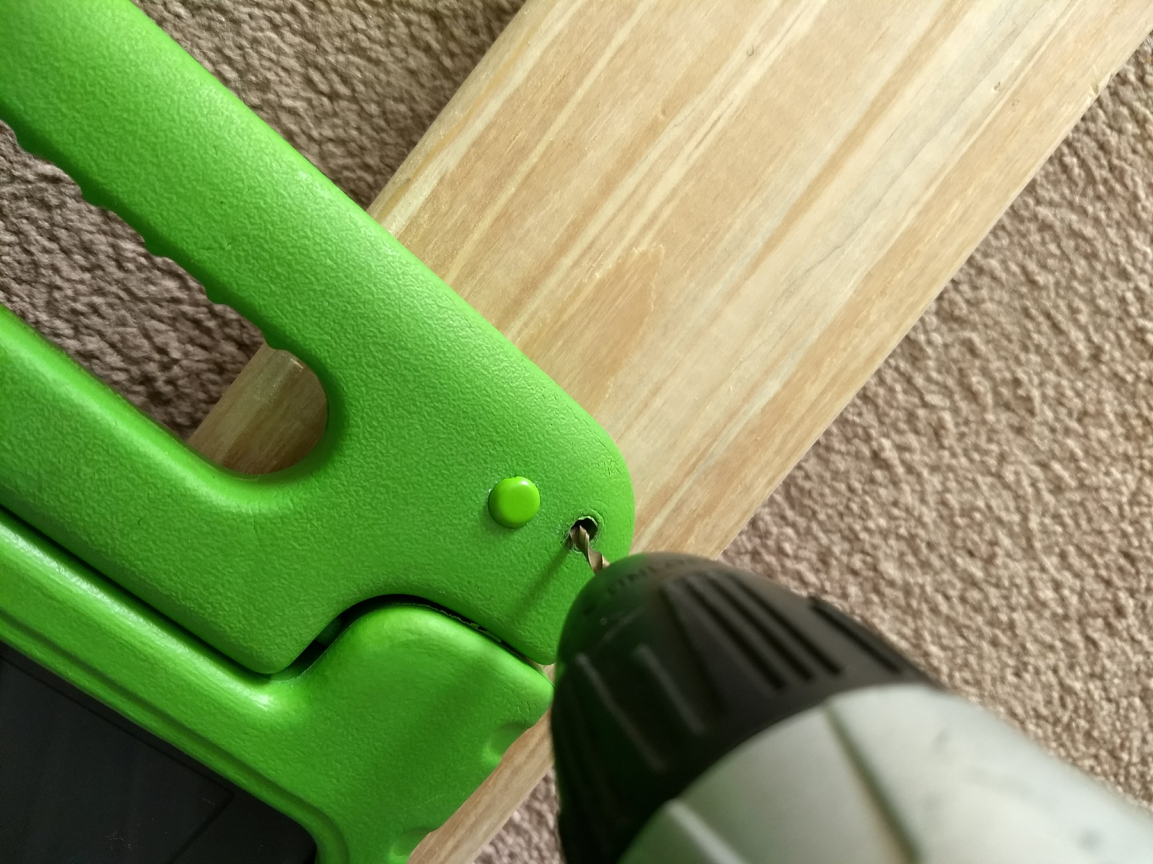 2: Drill two holes in your tablet case! Measure where the holes should go – notice where I made a mistake and had to cover it with a brad (though I think you could also hide your mistake with two buttons). I put the case flat on some wood and drilled my holes for the purse hardware. Try to not hit any important hinges or functional parts of the case. I’m not actually sure what size drill bit I used, but I think it might have been ¼”. Since my case was a soft squishy plastic, it was very forgiving.