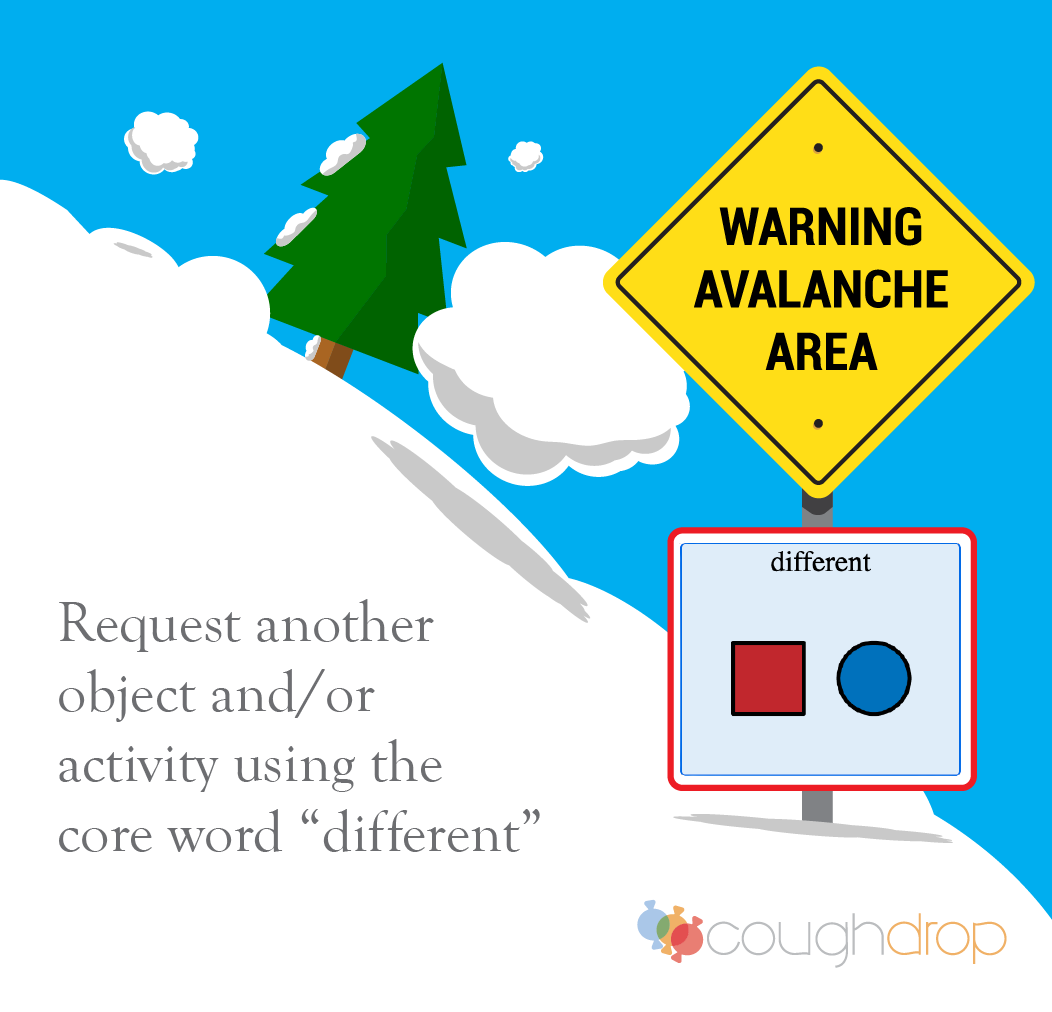 - Use “different” to request to play with another toy, game, or participate in another activity than what the individual is currently engaged in (“want different”, “want different [object or activity]”, “can I have different?”, “can I have a different [object or activity]?”). To create communication opportunities, give the individual an activity, show/movie, food, or toy/object that the individual does not like so that they are motivated to initiate communication to get something that they like.