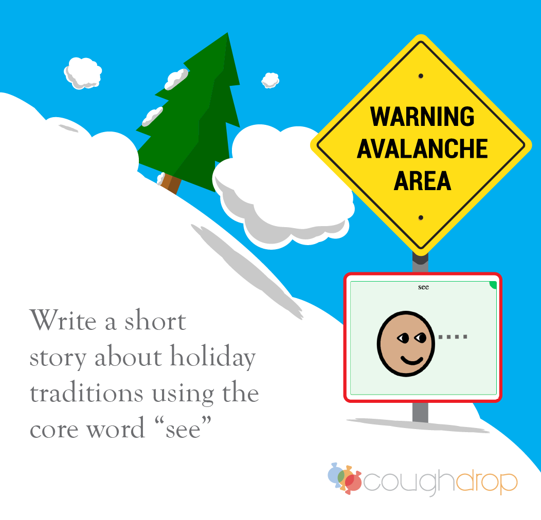 - Use “see” to write (and talk) about the individual's holiday traditions (“I see grandma/grandpa,” “I see aunt, uncle, cousins,” “I see lights,” “I see Santa,” etc.). You may save the story in the individual's AAC system so that they can tell their peers and teachers about their winter break when they go back to school in January.