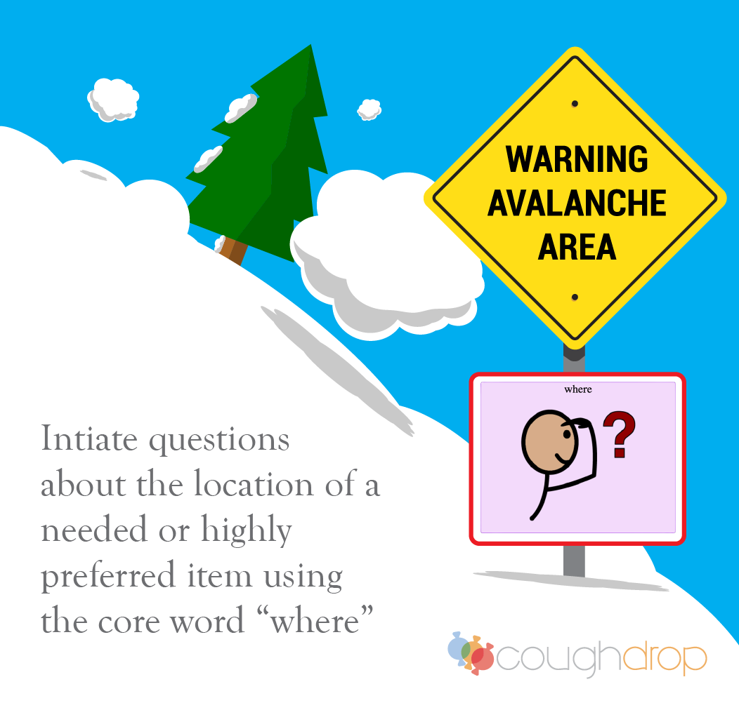 - Use “where” to discover the location of something that the individual needs or wants (“Where is it?” “Where is [item?]”). To create communication opportunities, internationally place a needed or wanted item where the individual will not be able to see or find it easily. Wait until they initiate communication to help them find the item.