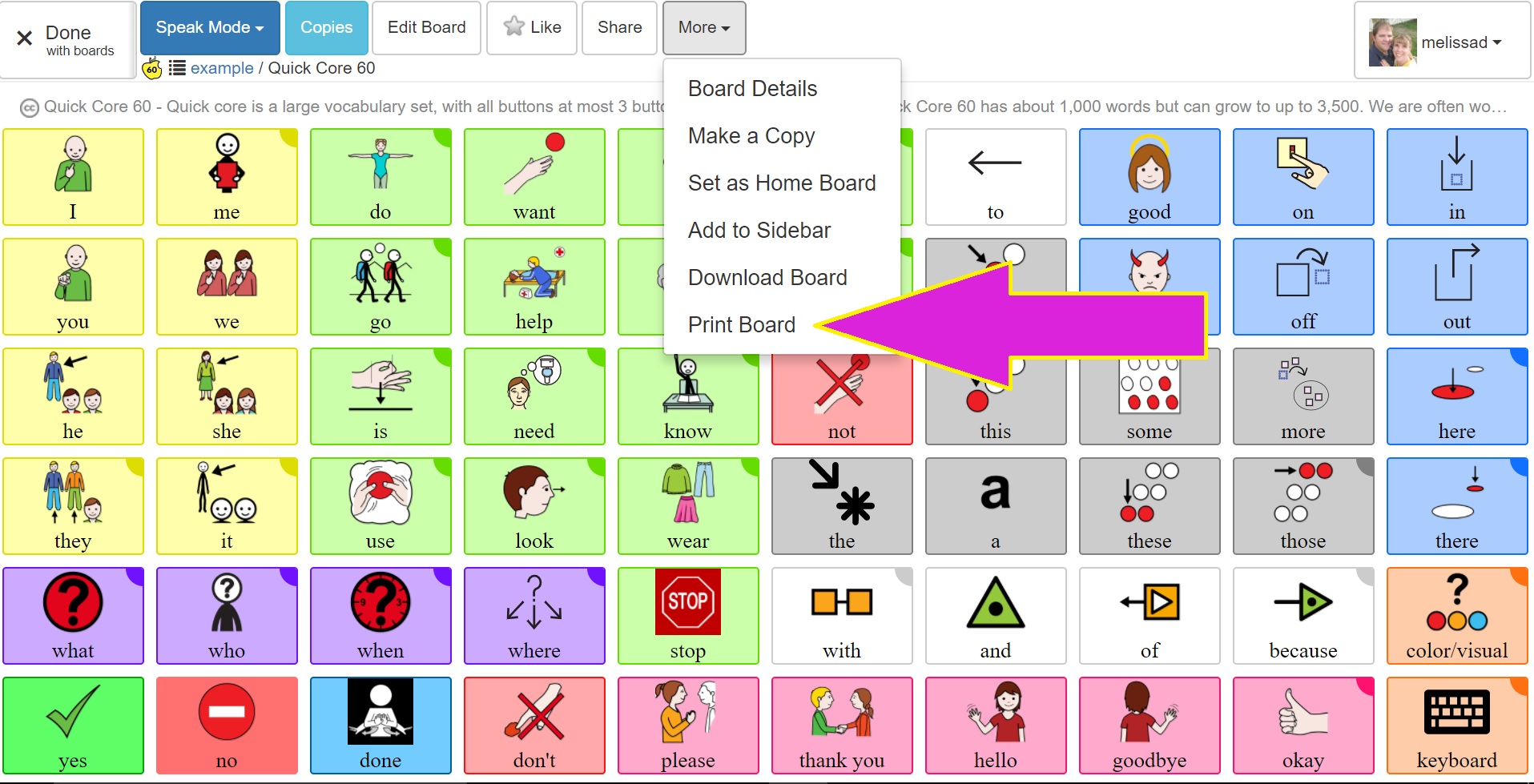 Open your the CoughDrop board set you want to use for your paper-based book, then select "print board" from the drop-down menu under "more."