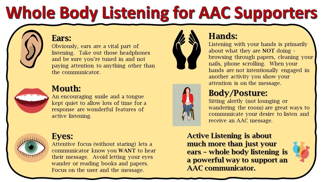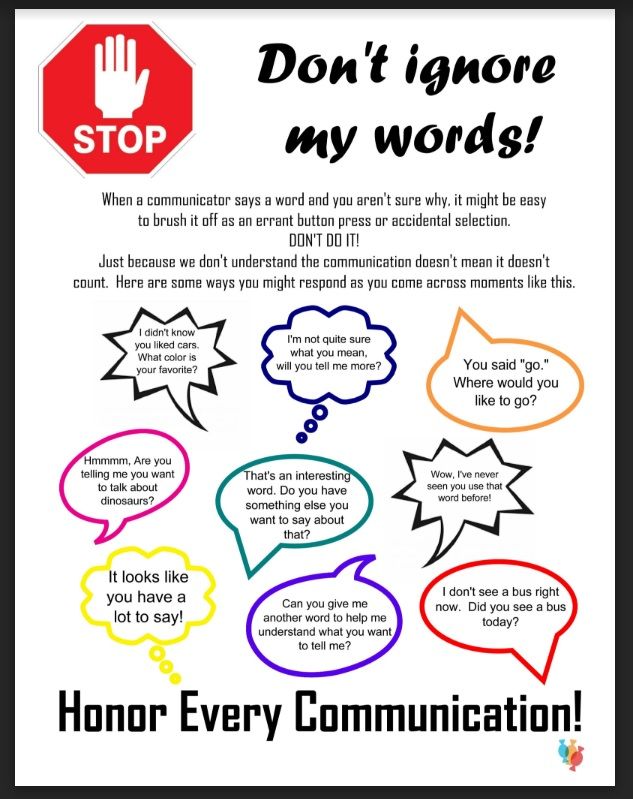 Do not ignore or push aside words spoken by AAC users even if they seem accidental, insignificant, or out of context. For many AAC users, it is difficult to make button selections – especially at first. You show that you are focused and interested in their message when you validate every communication even if you don't understand fully. - Expect Speech (sometimes ill-timed) From the Speech Device