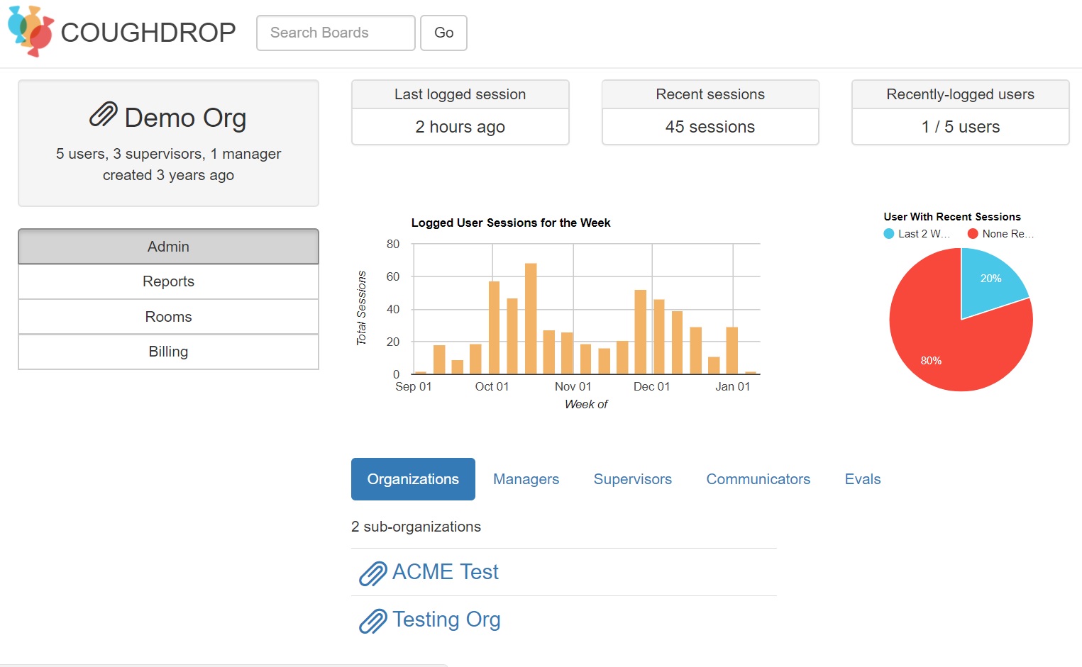 But we want to make your life easier, so CoughDrop has included in its organization management tool the option to divide communicators by room, assign a teacher or therapist to each group, and access it all from a manager's or supervisor's CoughDrop account.