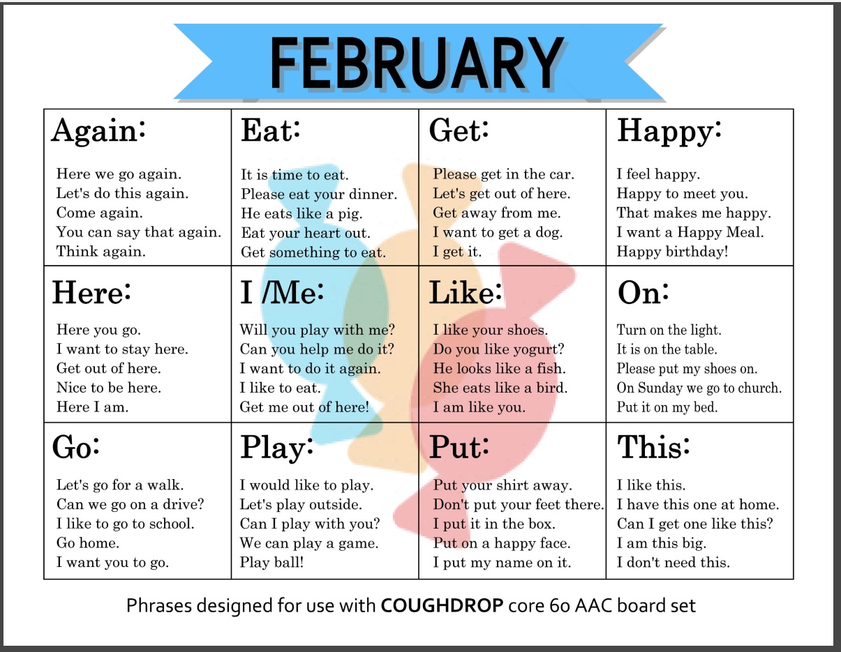 To make things even easier, CoughDrop has created an additional resource to help in modeling language. Based on the year of core words inventory, CoughDrop has fashioned a matching set of core phrases to support the support team as they work to model essential core words. These simple sentences provide ideas on how each core word might be incorporated into conversation and different ways the words could be used.